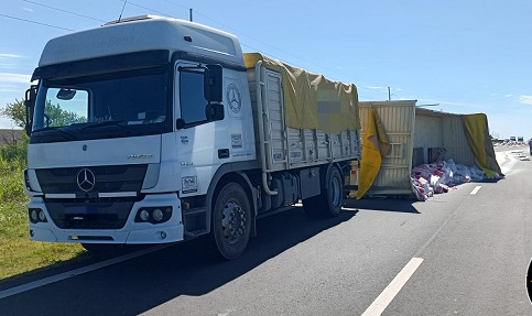 Por causas que se tratan de establecer, un camión que circulaba en sentido este-oeste, transportando una carga de arroz, perdió la estabilidad y el acoplado terminó volcado sobre la calzada.