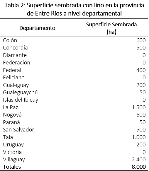 El 61% de la superficie destinada al lino se concentró en los departamentos: Villaguay, La Paz y Tala que abarcaron un área total de 4.900 ha.